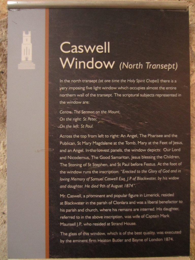 In her 1887 book A Descriptive and Historic Guide Through St. Mary’s Cathedral, Limerick, Francis Meredyth writes that the window is “a strikingly handsome stained glass memorial of the late Samuel Caswell, Esq., J. P., of Blackwater, presented by his daughter, Mrs. M. Maunsell, wife of Captain Mark Maunsell, J. P., Strand House, late of the Royal Dragoons, and by her mother, the widow of Mr. Caswell. This beautiful piece of art was the workmanship of Messrs. Heaton, Butler, and Bayne, of London, and reflects the highest credit on the skill and taste of their distinguished house. This window, also of five lights, may be thus presented in one view” (p 29).